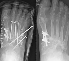 Degenerative Veränderungen zeigen sich am häufigsten im Bereich der Tarsometatarsalgelenke I-III-Gelenke 21. Hier kommt typischerweise eine Stabilisierung der medialen Säule mittels Lapidusarthrodese und Arthrodese der Tarsometatarsalgelenke II und III in Frage. In seltenen, meist posttraumatischen Fällen ist auch die laterale Säule mit den Tarsometatarsalgelenken IV und V betroffen. Letztlich gilt es präoperativ zu erörtern, welche der Gelenke Lisfranc Gelenkreihe schmerzhaft sind, um diese gezielt versteifen zu können.