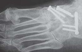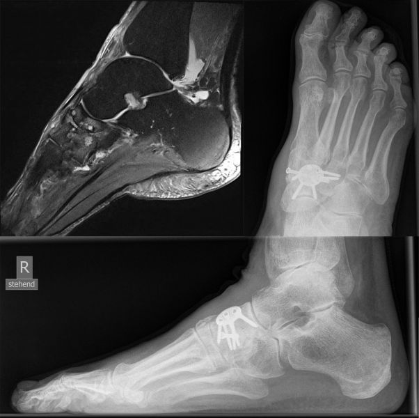 Die Operation erfolgt meist über einen medialen Zugang. Nach Entknorpeln der Gelenkflächen und Anfrischen des subchondralen Knochens kann die Arthrodese mit Schrauben oder Plattensystem erfolgen (Abb. 5). Bei Fehlstellungen muss diese vor der Osteosynthese korrigiert und das Talonavikulargelenk reponiert werden. Pseuarthrosen werden hier zwischen 8-25% angegeben 3223.
