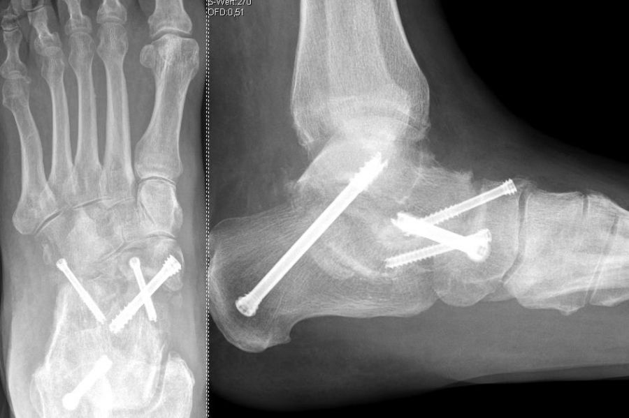 Sollten Fußfehlstellungen im Sinne eines Hohlfußes oder Knick-Senk-Plattfußes bestehen, sollte diese Fehlstellung ebenfalls adressiert werden. Das Ziel der Operation ist eine anatomisch ausgerichtete, stabile Arthrodese mit erfolgreich fusioniertem Gelenk und dadurch einer Verminderung der Schmerzen sowie Verbesserung der Funktion mit Wiederherstellung der gleichmäßigen Verteilung der gewichttragenden Last.