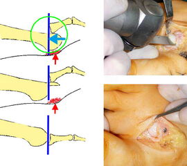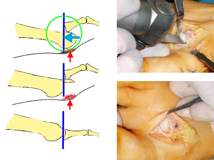 Liegt zusätzlich bereits eine teilkontrakte Dorsalflexion des Grundgliedes im Metatarsaophalangealgelenk vor, so muß diese unbedingt über ein Kapselrelease im jeweiligen MTP Gelenk korrigiert werden.