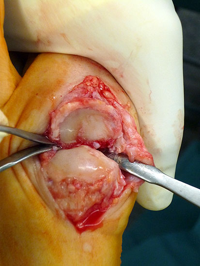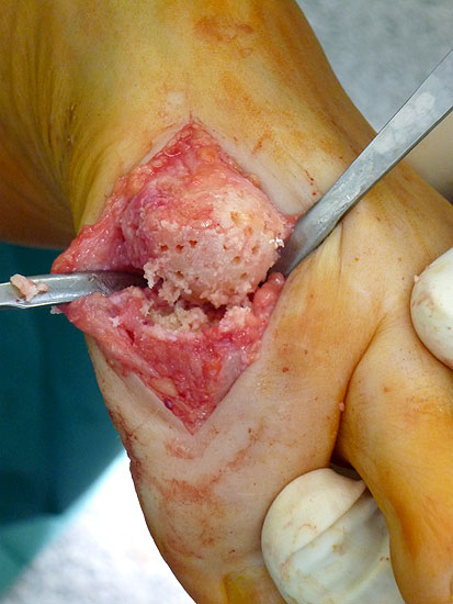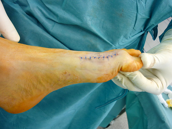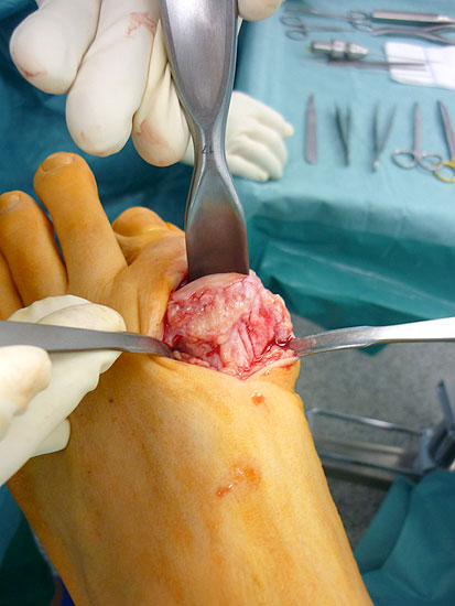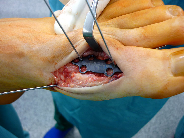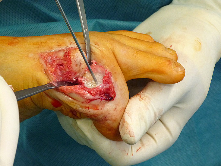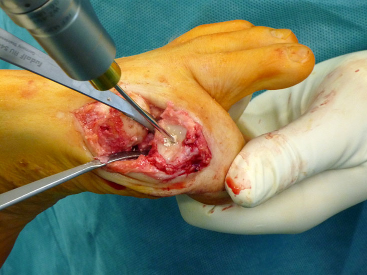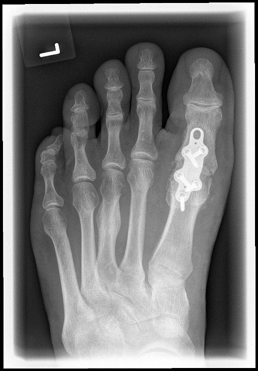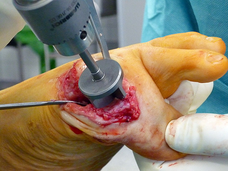 Das nachfolgend präsentierte OP-Verfahren zeigt die Großzehengrundgelenkarthrodese mit Gelenkflächenpräparation mittels sogennanter „Cup-and-Cone“-Fräsen und einer dorsal angebrachten variablen winkelstabilen Platte mit Gleit-/Kompressionsloch.