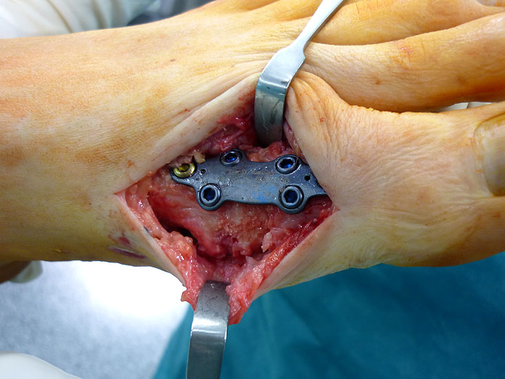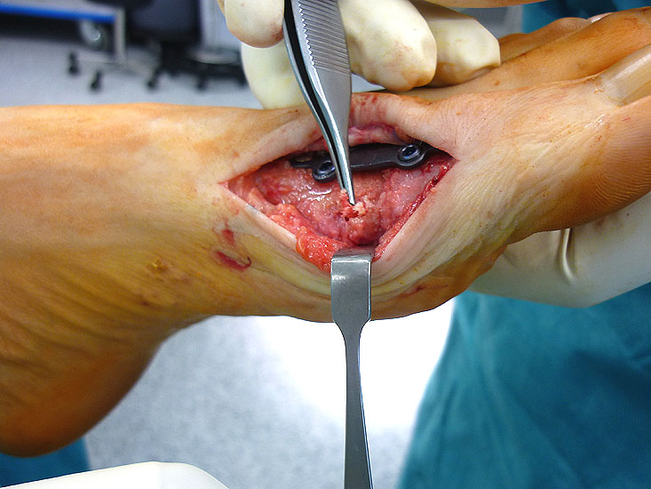 Entscheidend ist die korrekte Einstellung der Arthrodese und sichere Osteosynthese. Gekreuzt eingebrachte Schrauben werden immer noch als kostengünstige Standardtechnik der Osteosynthese beschrieben und können bei kräftigen und stabilen Knochenverhältnissen und entsprechender Erfahrung prinzipiell verwendet werden 141516. Der Einsatz kanülierter Schrauben unter Durchleuchtung erleichtert die Operation. Die Fixation mit mehreren Klammern (Stapels) ist zwar schnell und einfach in der Handhabung, bietet aber nur eine verminderte Primärstabilität 1718.
