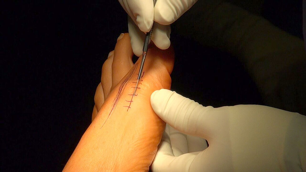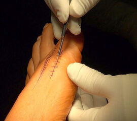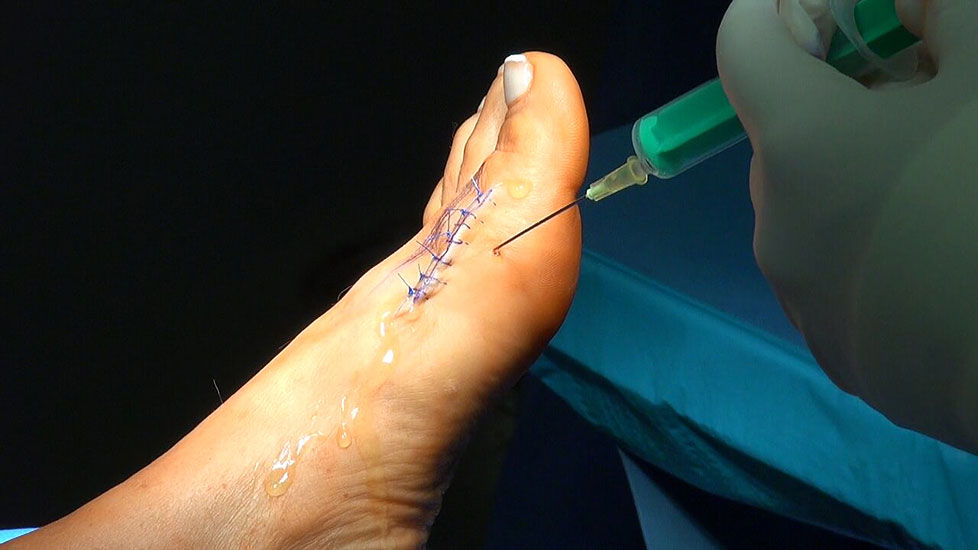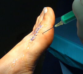 Intubationsnarkose, Larynxmaske, spinale Leitungsanästhesie, Fussblock oder Leitungsanästhesie Beim Fussblock werden im proximalen Knöchelbereich 30 bis 40 ml Ropivacain um den Nervus peronaeus superficialis, Nervus peronaeus profundus, Nervus suralis, Nervus saphenus sowie Nervus tibialis posterior verabreicht.