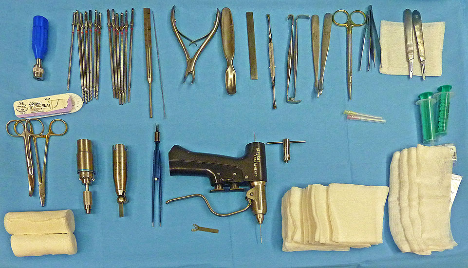 Allgemeines Fußinstrumentarium mit Pinzetten, Skalpell(en), Klemmchen, Luer, kleiner Meisel, Seidenschneider, Zange, kleine Langenbeckhaken und Hohmann-Hebel, Präparierschere, kleines Raspatorium und McGlamry Elevator (Abbildung 2)
