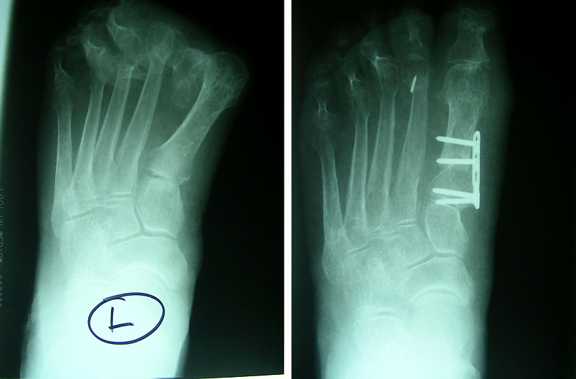 - Beseitigung der Druckschmerzen über dem Großzehenballen durch Korrektur des Spreizfußes.