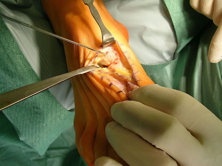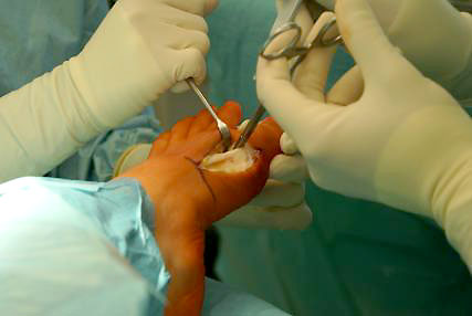 - Reposition des Großzehengrundgelenkes durch ein Release der lateralen Gelenkkapsel und Reposition des MT I über die Sesambeine, zusätzliche Lockerung der Sesambeinaufhängung.
