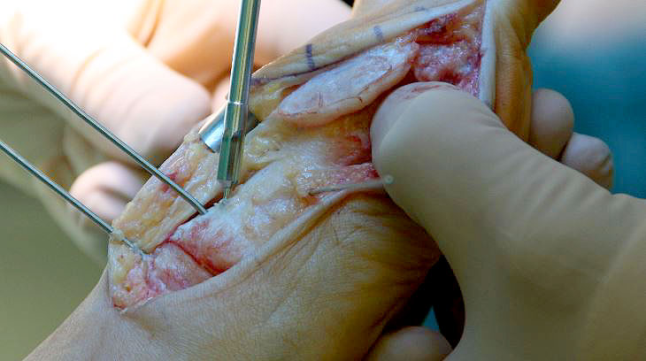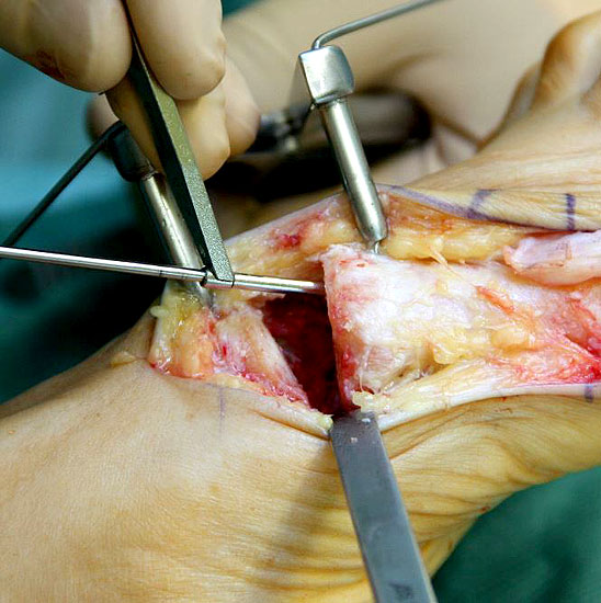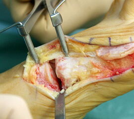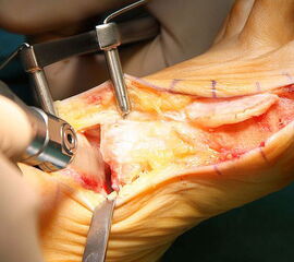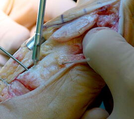 Kompromittierung oder postoperative Adhäsion der Flexor hallucis longus-Sehne, der Extensor hallucis longus-Sehne und der Abductor hallucis-Sehne.