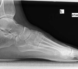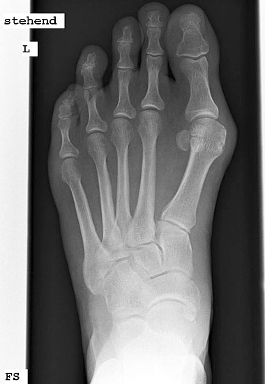 Röntgenaufnahme des Fußes im Stehen im dorsoplantaren und seitlichen Strahlengang (Abb. 1a-b).