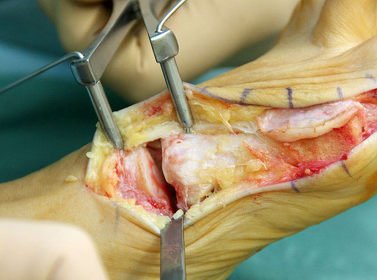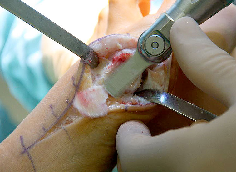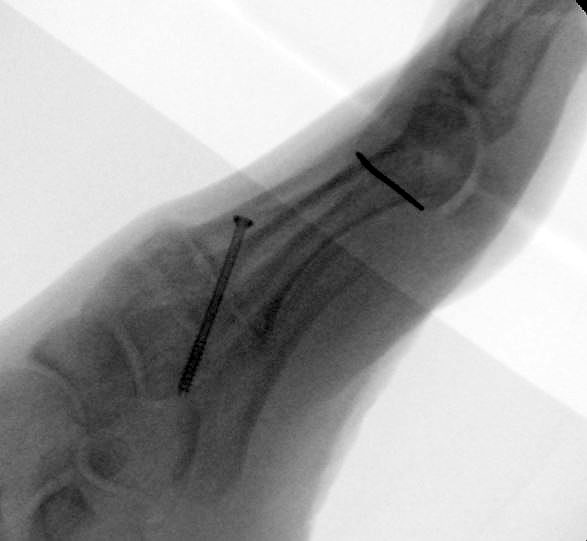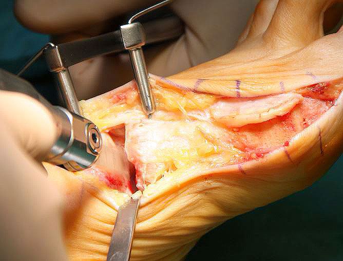 Es wird hier die Lapidusarthrodese mit Fixation durch eine medial angebrachte winkelstabile Platte in Kombination mit einer Zugschraube beschrieben 2. Durch diese Kombination läßt sich eine verglichen zur Schraubenosteosynthese hohe Primärstabilität erreichen, verbunden mit einem niedrigen Risiko einer Pseudarthrosenbildung 3.