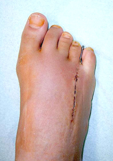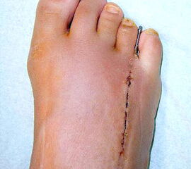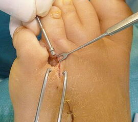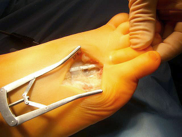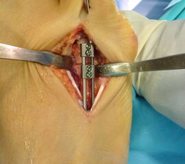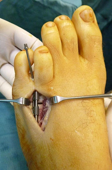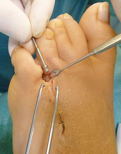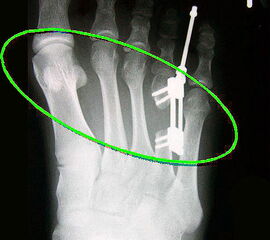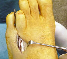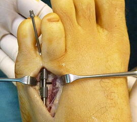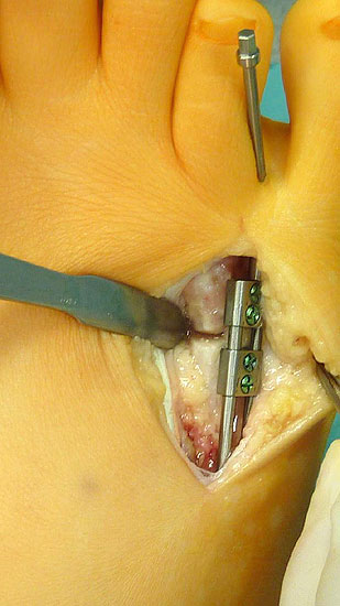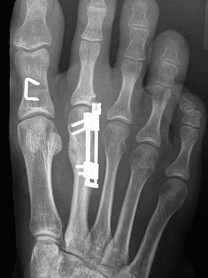 - Dritter Eingriff: Materialentfernung (Minifixateur interne) bei vollständiger knöcherner Durchbauung, hierbei ist in seltenen Fällen eine Lösung von Verklebungen der Strecksehnen und des Metatarsophalangealgelenks erforderlich.