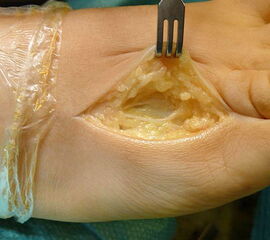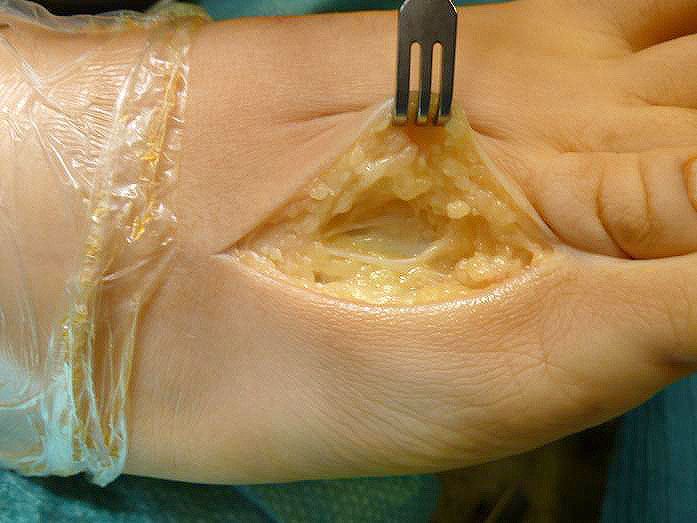 - Zweiter Eingriff: Diskonnektieren des transcutan ausgeleiteten Aktivator, falls möglich, über eine kleine Inzision von 1,5 bis 2 cm, in der Regel jedoch über Eröffnen der alten Schnittführung mit ggf. Strecksehnenverlängerung und erneutem Grundgelenk-Release sowie ggf. Ausleiten einer Penroselasche oder einer Gentamycin-Palacos-Minikette.