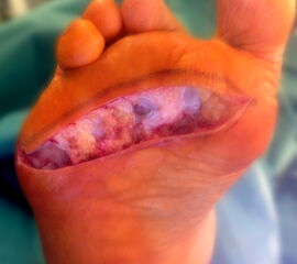 Das plantare Fettpolster wird in die Auftrittsfläche reponiert und mit Vicryl vernäht. Die plantare Hautnaht erfolgt mit robustem, nicht resorbierbarem Nahtmaterial (z.B. Ethilon 2,0).