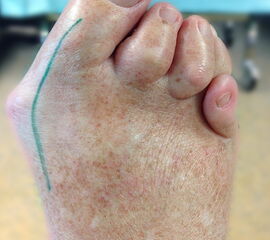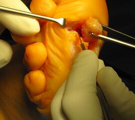 Führt der plantare Weichteilverschluss zu keiner ausreichenden Stabilisierung der Zehengrundgelenke, kann durch eine Nachresektion der Wundränder am plantaren Zugang der korrigierende Effekt der Dermatodese verstärkt werden.