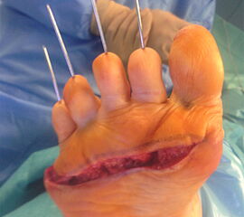Anleitung des Patienten in der Pflege der K-Drähte, Verbandswechsel und gegebenenfalls Zehen zügeln.