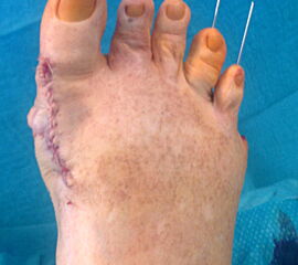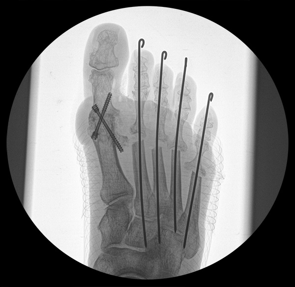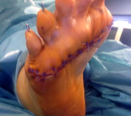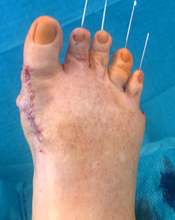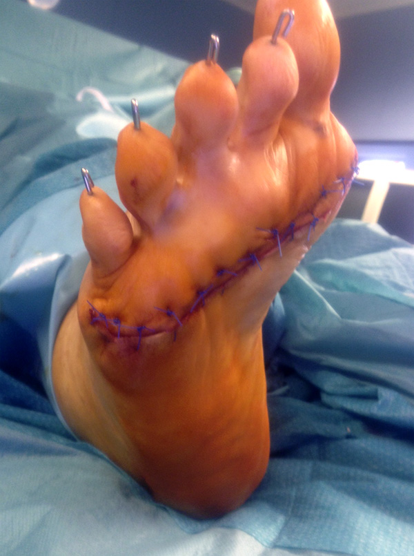 Abschließend erfolgt die temporäre K-Daht Fixation sämtlicher Kleinzehen in achsgerechter Stellung. Die Strecksehnen werden in Verlängerung vernäht.