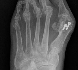 In Abhängigkeit vom Eingriff am Metatarsale I: Verlängerte Knochenheilung durch Osteoporose, die rheumatische Erkrankung, sowie durch die Rheumamedikation.