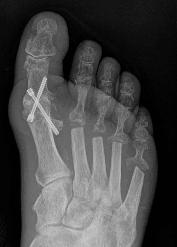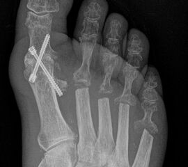 Relativ schnelle Belastbarkeit in Abhängigkeit des Eingriffes am ersten Strahl, da keine metatarsalen Osteotomien heilen müssen (viele Rheumapatienten haben Probleme an der oberen Extremität und können eine längere Ent- oder Teilbelastung an Unterarmgehstützen nicht umsetzen). Auch führt die medikamentöse Therapie, insbesondere Biologicals, häufig zu einer Verzögerung der Knochenheilung 22.
