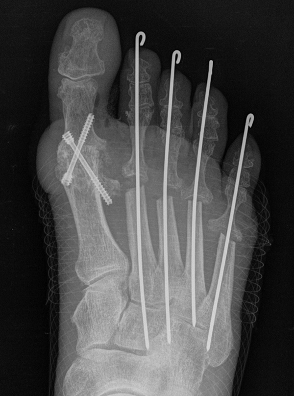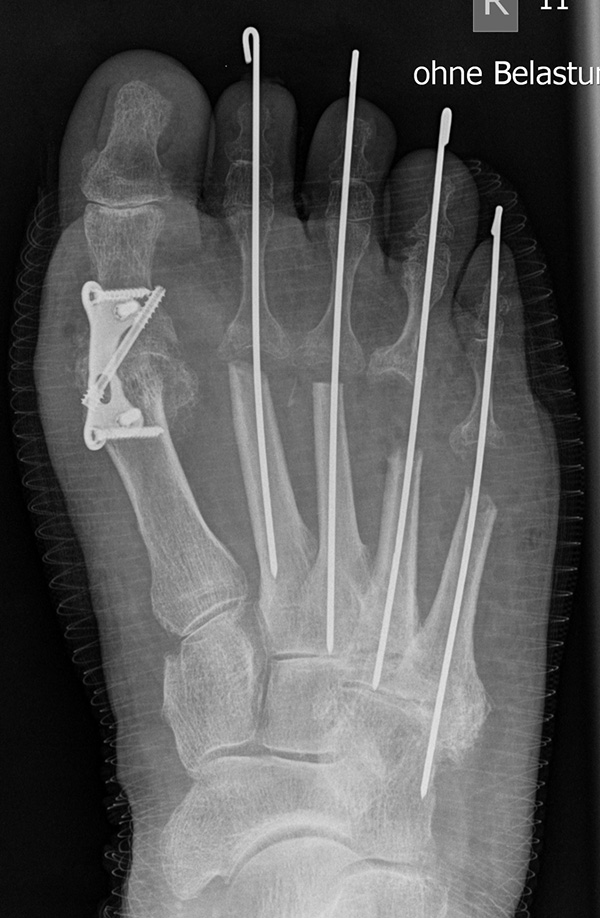 Die Entfernung der K-Drähte wird sechs Wochen postoperativ im Rahmen der Sprechstunde geplant. Anschließend empfiehlt sich eine weitere Redression der Kleinzehen bis 3 Monate postoperativ bis sich das Narbengewebe ausreichend stabilisiert hat.