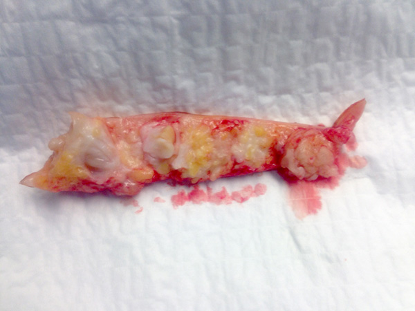 Entfernung von Rheumaknoten und Bursen plantar sowie Reposition des nach distal dislozierten plantaren Fettpolsters durch die Dermatodese.