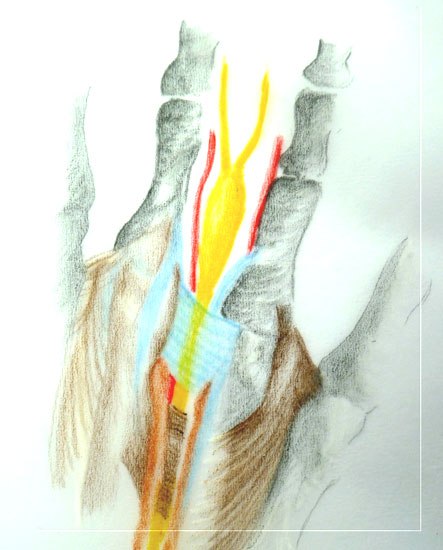 In der Regel ist jedoch eine fibrotische Verdickung des Nerven auf Höhe der Nervenaufzweigung oder unmittelbar distal der Aufzweigung nachweisbar. Diese Tumorartige Neurombildung wird nun sowohl nach distal als auch nach proximal verfolgt und reseziert. Die verbliebenen Nervenenden werden verödet, der proximale Stumpf wird unter dem m.lumbricalis gelagert (Myerson M. 2005).
