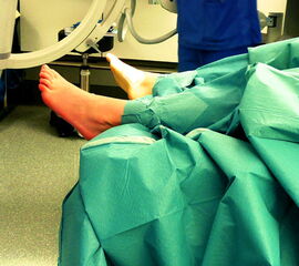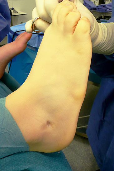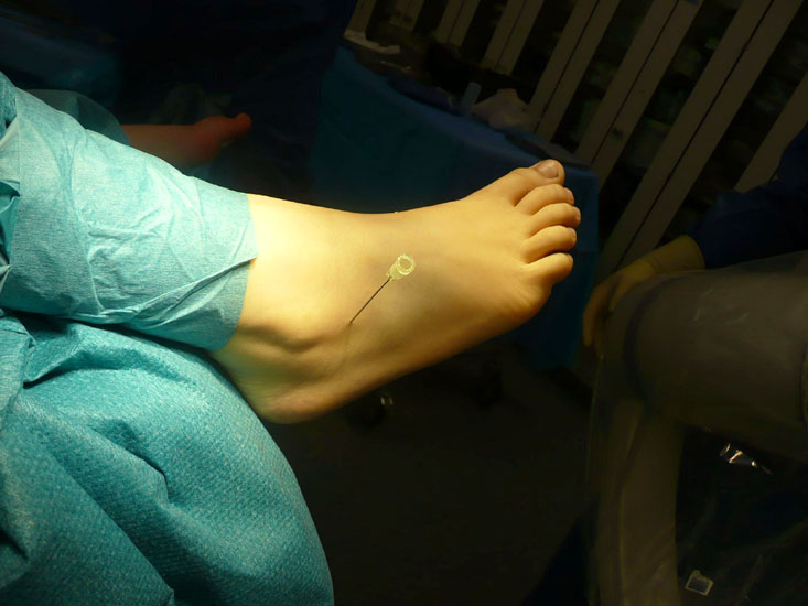Abwaschen und steriles Abdecken beider Füße in Rückenlage und Unterschenkelblutleere (Abb. 1). Ertasten des Sinus Tarsi, zur genaueren Lokalisation Verwendung einer Kanüle (Abb. 2) um die korrekte Position über dem Eingang zum Sinus tarsi unter Bildverstärker zu kontrollieren. Über einen 1-2cm messenden Hautschnitt (Abb. 3) erfolgt nun die Präparation des Eingangs zum Sinus tarsi durch stumpfe Präparation. Die Knochenoberfläche des Calcaneus am tiefsten Punkt des Sinus tarsi wird dargestellt, unterstützt durch eine manuelle Rückfußinversion. Nach Markieren der korrekten Eintrittstelle mit einem Kirschnerdraht und anschließender Bildwandlerkontrolle (Abb. 4) wird nun die calcaneare Eintrittstelle in ca 20° Kippung nach lateral und dorsal mit einem 3,2mm Bohrer aufgebohrt.