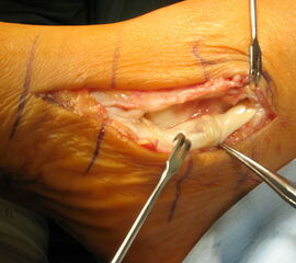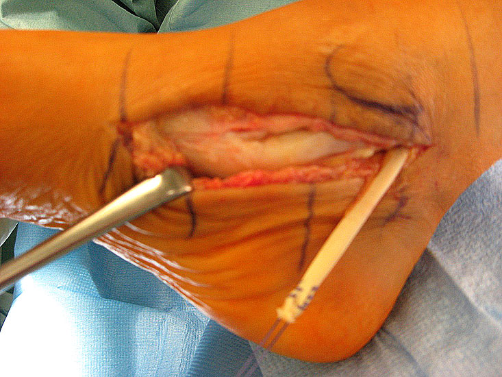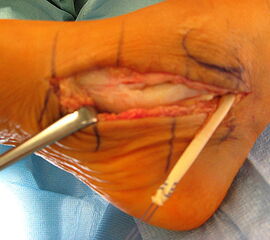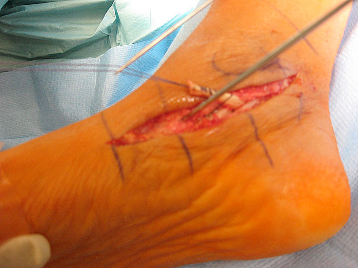 Alternativ können unterschiedliche Möglichkeiten zur Fixation der transferierten Sehne im Knochen gewählt werden (z.B. kann die Sehne durch ein Bohrloch im Os navikulare gezogen und mit sich vernäht werden) 6591011.