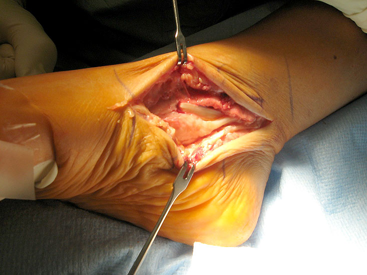 Intraoperativ wurden folgende Pathologien gefunden: Tendinopathien 33%, Teilrupturen 22%, Komplettrupturen 44%. In 75% der Fälle fanden sich zusätzlich Rupturen des „Spring ligaments“.
