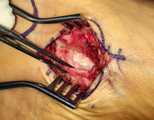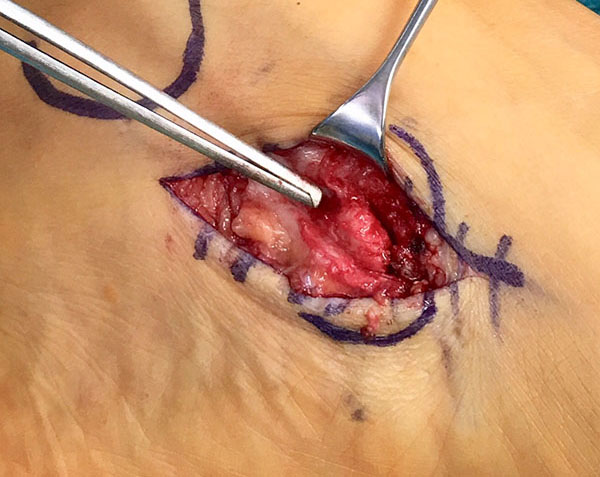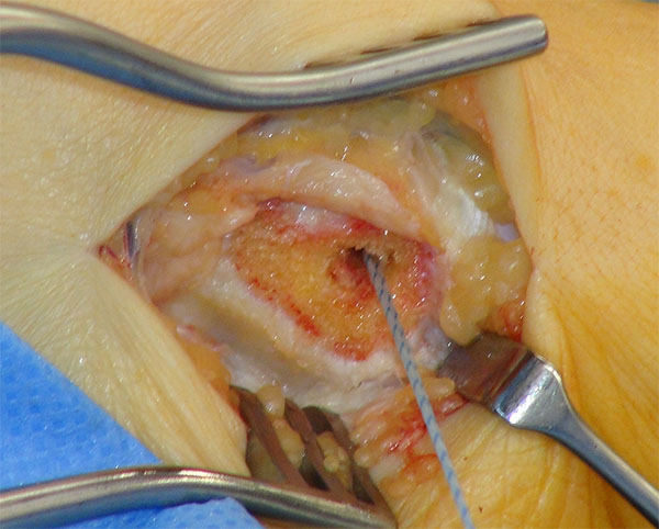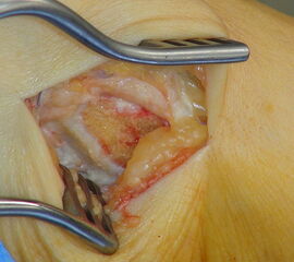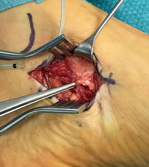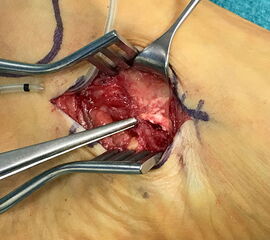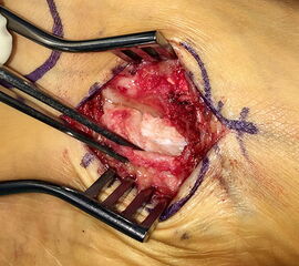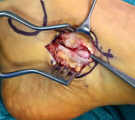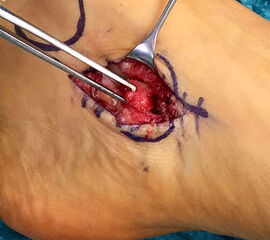 - Beim Herauslösen des Os tibiale externum sollten die kaudal zum Os naviculare verlaufenden Fasern der Tibialis posterior Sehne geschont werden. Somit wird eine vollständige Ablösung der Sehne vermieden. Grundsätzlich ist nur so viel des Sehnenansatzes abzulösen, wie zur Entfernung des Knochens notwendig.