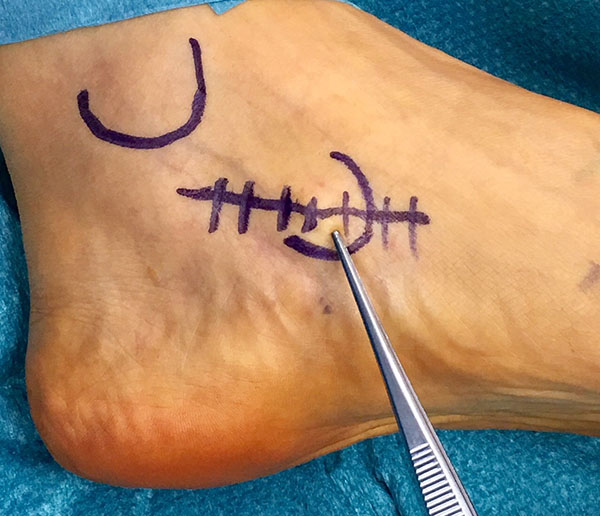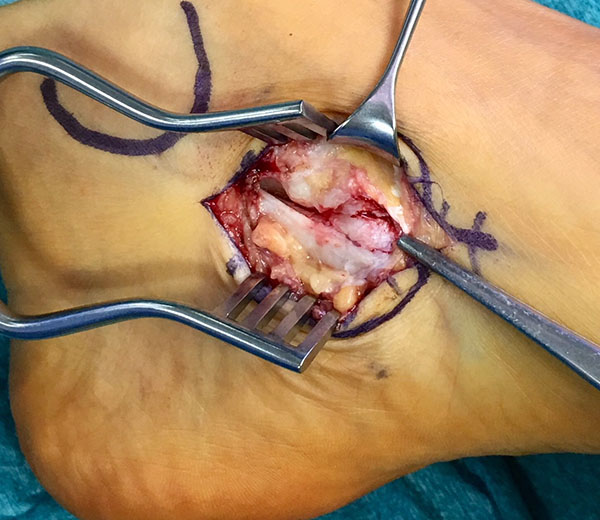 Resektion des Os tibiale externum bzw. Abtragung des medial prominenten Os naviculare cornutum und Refixation der Tibialis posterior Sehne am Os naviculare.