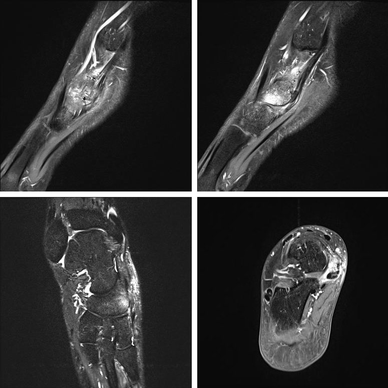 - Bei unklarem Befund kann die Bildgebung mittels MRTvervollständigt werden. Das MRT zeigt eine mögliche Aktivierung der Synchondrose bzw. erlaubt auch andere Differentialdiagnosen (Tendonose der Tibialis posterior Sehne, Verletzung Deltaband, Verletzung Pfannenband) auszuschließen (Abb. 3) 6 (Szeimies 2014).