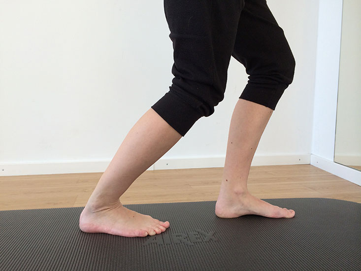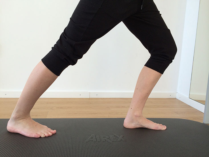 Beide Füße haben Kontakt mit dem Boden, die Zehenspitzen sind in Blickrichtung. Das hintere Bein ist durchgestreckt, die Hüfte wird nach vorne geschoben. Die Ferse bleibt am Boden.