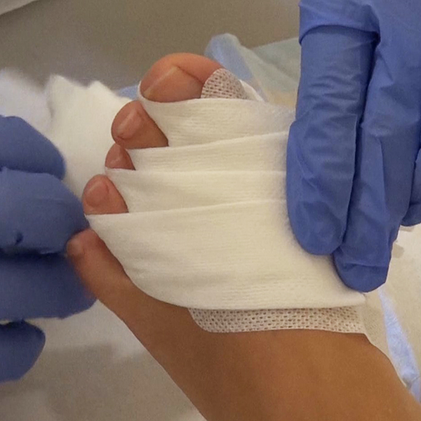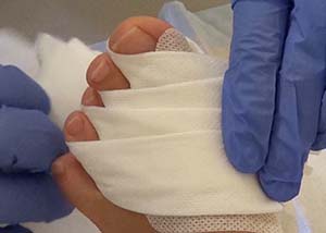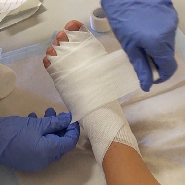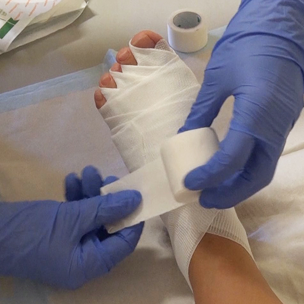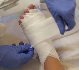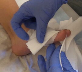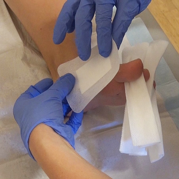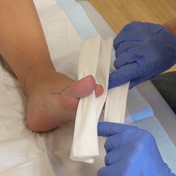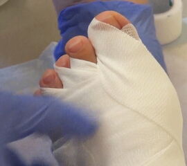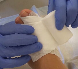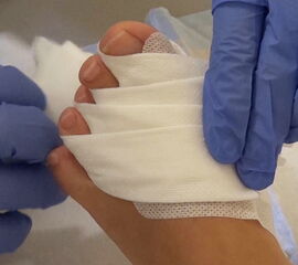 Der hier dargestellte Verband zeigt ein typisches Vorgehen nach Hallux valgus Korrektur. In Abhängigkeit von der vorliegenden Deformität sind möglicherweise Abweichungen von diesem Vorgehen notwendig.