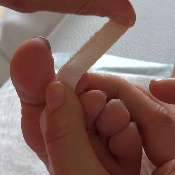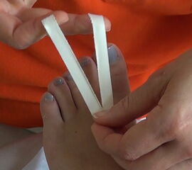 Wichtig: Nach minimalinvasiven Korrekturen der Kleinzehen kommt dem Tapeverband eine entscheidende Rolle zur Sicherung des Operationsergebnisses zu. Da keine zusätzlichen Drähte verwendet werden, führt ein vorzeitiges Entfernen möglicherweise zu einem schlechteren Behandlungsergebnis. Gleiches gilt, wenn die Zehe in einer Fehlstellung stabilisiert wird. Die Stellung der Zehe im Tapeverband sollte der Stellung entsprechen, die als finales Behandlungsergebnis gewünscht wird.