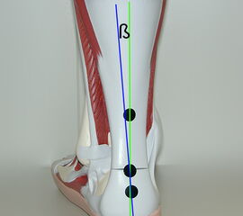 Im Zusammenhang mit Achillessehnenbeschwerden wird oft ein erhöhter Achillessehnenwinkel im Sprunggelenk als Ursache genannt 67. Der Winkel entsteht durch die Anpassung der Fußstellung an den Untergrund. Das physiologisches Maß wird mit 8-12° angegeben (Ludwig 2015) (Abb.1a + Abb.1b). Die Achillessehne ist in dieser Stellung optimal belastet. Eine Vergrößerung des Achillessehnenwinkels, z. B. durch eine mediale Instabilität des Fußes und daraus resultierender übermäßiger Pronationsbewegung hat eine Veränderung der Zugrichtung mit intratendinösen Scherkräften zur Folge (Weisskopf 2017). Dies kann bei einem Missverhältnis zwischen Belastung und Belastbarkeit der Sehne zur Überlastung führen.