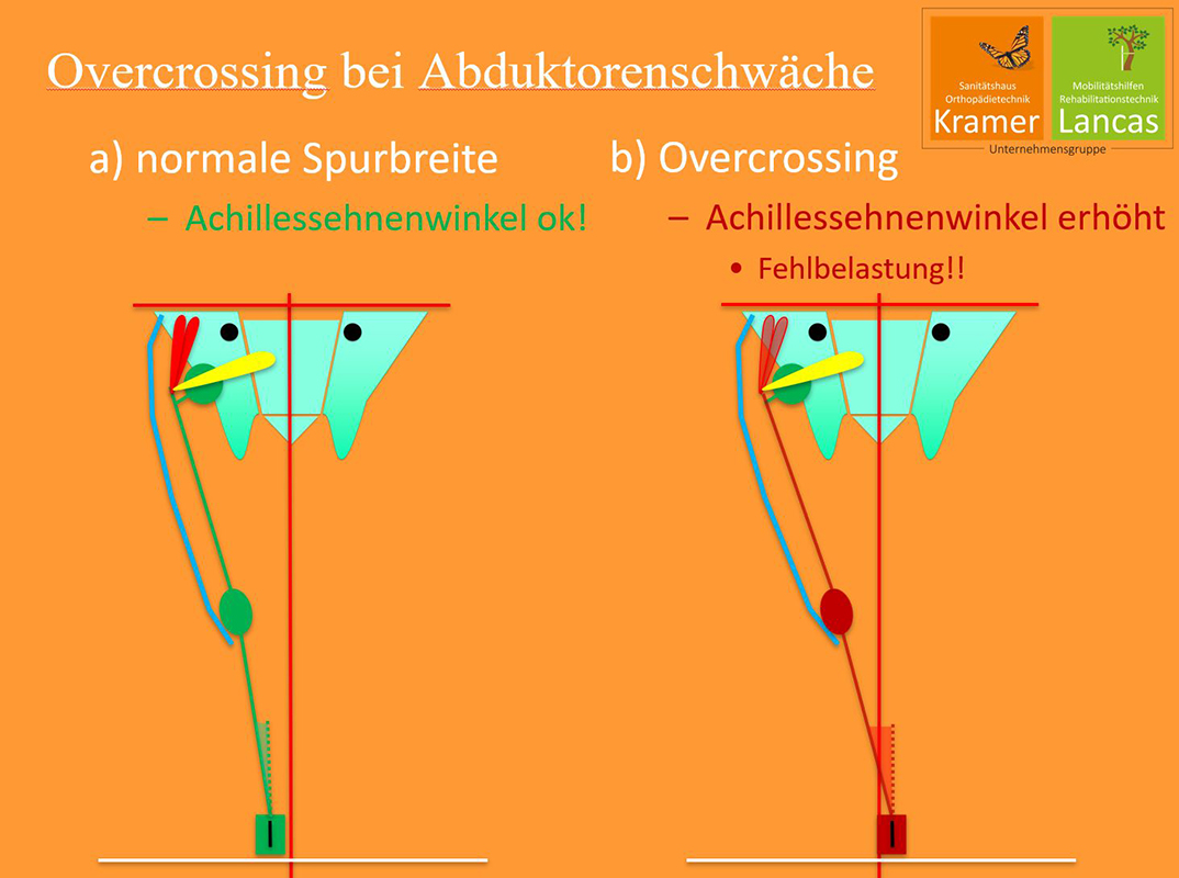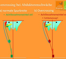 Im Fallbeispiel der Läuferin mit anhaltenden Achillessehnenproblem konnte in der Bewegungsanalyse nachgewiesen werden, dass ein Überkreuzen der Füße in der Laufbewegung (Overcrossing) die Belastung der Achillessehne bei jedem Schritt veränderte. Dieses Overcrossing resultiert aus der insuffizienten Stabilisierung des Beckens in der einbeinigen Stützphase. Alle Maßnahmen in der Schmerzregion wie orthopädische Einlagen oder Physiotherapie blieben unwirksam, weil die Fehlbelastung durch das Overcrossing auch nach der Sportpause oder der Physiotherapie unverändert vorhanden war. Durch Kräftigung- und Koordinationsübungen sowie Optimierung der Lauftechnik konnte die funktionelle Beckenstabilität wiederhergestellt werden, was zur Ausheilung der Achillessehnenprobleme führte. Der Schlüssel war durch eine normale Spurbreite beim Laufsport eine physiologische Belastung der Achillessehne zu erreichen.