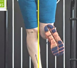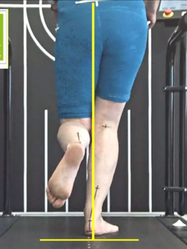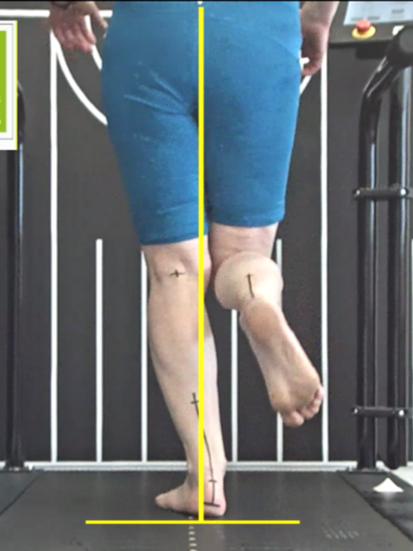 Zunächst ist es wichtig, die Stabilität am Schmerzort, also an Fuß und Sprunggelenk zu verbessern. Für den Bewegungsablauf geeignete Laufschuhe und eine individuelle Einlagenversorgung sollen die Fersenstellung optimieren und können so die physiologische Zugrichtung der Achillessehne wiederherstellen. Dies ist die Grundvoraussetzung für eine physiologische Belastung der Achillessehne. Bei unserer Läuferin ist dies bereits geschehen, wie die Bilder vom Laufen mit den getragenen Laufschuhen und vorhandenen Einlagen zeigen (Abb.14 + Abb.15). Diese lokale Maßnahme hat aber nicht zum Abklingen der Beschwerden geführt, denn durch das weiterhin vorherrschende Overcrossing bleibt der Achillessehnenwinkel bei jedem Schritt erhöht (Abb.16 + Abb.17).