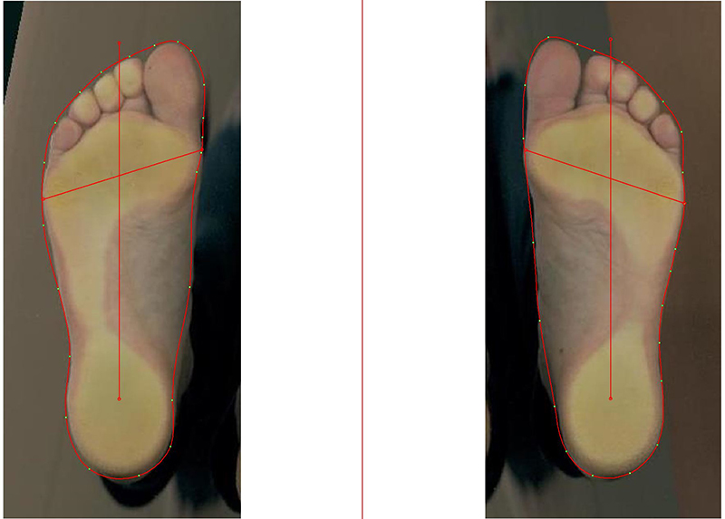 Die Fußanalyse im beidbeinigen Stand mit dem zweidimensionalen Fußscanner zeigte beidseits einen Knickfuß, der sich durch die im Vergleich zum Normalfuß schwache laterale Verbindung zwischen Vorfuß- und Fersenbereich erkennen lässt (Abb.2). Das Standbild aus der Bewegungsanalyse bestätigt dies (Abb.4). Die mediale Instabilität wird in der dynamischen Fußdruckmessung noch deutlicher: die Verbindung zwischen Vorfuß und Ferse reißt ganz ab, die Vorfußbelastung ist stark medial geprägt und die Ganglinie weit nach medial verlagert (Abb.3).