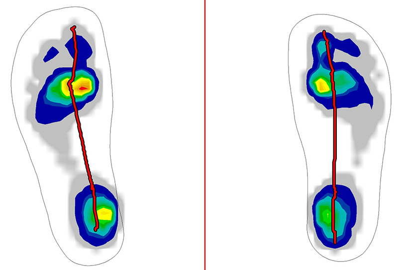Vor der Bewegungsanalyse wird eine Analyse der Fußstellung durchgeführt. Dazu eignet sich ein zweidimensionaler Fußscan im Stand (Abb. 2), der neben der statischen Fußbelastung auch Hautveränderungen wie Schwielen oder Hornhaut sichtbar macht. Einen größeren Stellenwert nimmt die Beurteilung der dynamischen Fußbelastung ein. Mit einer Druckmessplatte kann die Fußbelastung während des Gehens gemessen werden (Abb. 3). Die dynamische Fußdruckmessung (Pedobarographie) ermöglicht die Beurteilung der Fußfunktion im Hinblick auf die aktive Stabilisierung und die Abrollbewegung in der Belastungssituation der einbeinigen Stützphase. Oft können schon an dieser Stelle wertvolle Hinweise auf mögliche Beschwerdeursachen gewonnen werden 8.