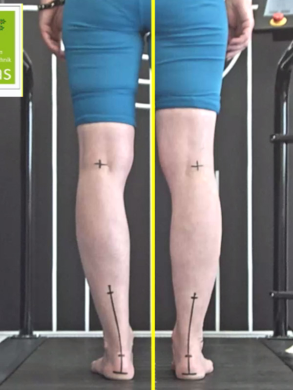 In der Bewegungsanalyse wird zunächst die Fußstellung während der Standphasen in der konkreten Laufsituation deutlich. Hier ist eine deutliche Instabilität des Fußes im Barfußlauf erkennbar, die von einer verstärkten Abduktion des Fußes in der Längsachse begleitet wird (Abb. 5 + Abb. 6). Diese Faktoren führen zu einer unphysiologischen Fußstellung unter dem Schienbein, die Achillessehnenbelastung wird negativ verändert.