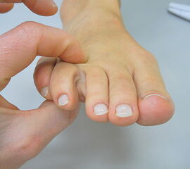 Video: Klingelknopf-Zeichen - Druckschmerz zwischen den Metatarsale-Köpfchen III und IV, seltener auch zwischen II und III bei Druck von plantar. Das Klingelknopfzeichen tritt im Rahmen einer Morton-Neuralgie auf. Teilweise ist der Schmerz von elektrisierendem Charakter (C. Zanzinger/M. Walther).