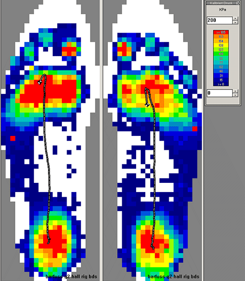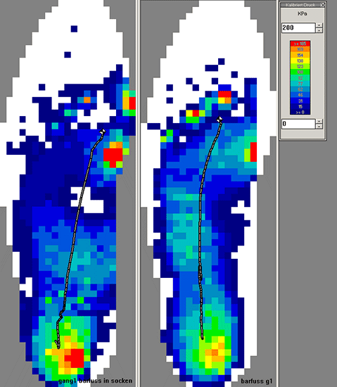 Für die Simulation eines Barfußgangs fixieren wir in unserem Labor für Gang- und Bewegungsanalyse die Druckmessfolien, indem der Patient einen dünnen Strumpf anzieht. Mit dieser Methode können verfälschende Einflüsse des Schuhwerks auf die Schrittabwicklung und Druckverteilung vermieden werden. Die Praktik der in manchen Laboren durchgeführten Verwendung von Ballettschuhen sehen wir u.a. aus hygienetechnischen Gesichtspunkten kritisch.