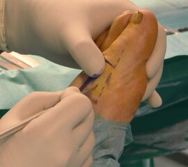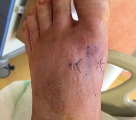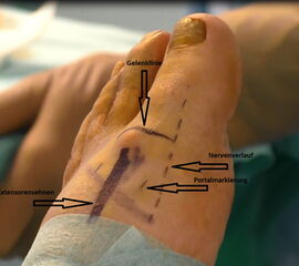- Trotz der Einfachheit des Verfahren sind bei ungenügenden anatomischen Kenntnissen oder fehlender Erfahrung Verletzungen wichtiger Strukturen, hier insbesondere der Extensorensehnen, möglich.