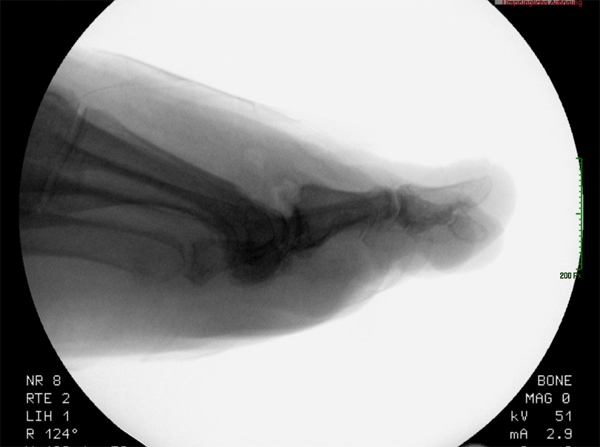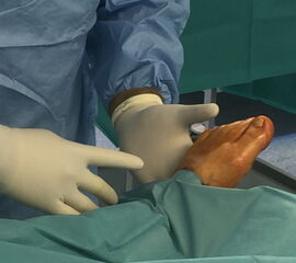 Die bei der konventionellen Cheilektomie erforderliche Verbandsschuhversorgung ist nicht zwingend erforderlich. Vielmehr ist eine Vollbelastung mit Abrollbewegung ab dem 1. postoperativen Tag erwünscht. Dies unterstützt die postoperative Thromboseprophylaxe und wirkt einer Schwellungsneigung entgegen. Die Vollbelastung erfolgt bei unseren Patienten in gewöhnlichen Badeschuhen mit weicher Sohle.