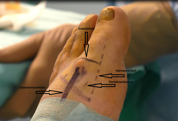 Über eine beeindruckende Entwicklung der minimalinvasiven Fuß- und Sprunggelenkchirurgie wurde in den letzten Jahren viel berichtet. Es ist mittlerweile unumstritten, dass durch die anatomischen Studien, standardisierte intraoperative Vorgehensweise (de Prado 2003) und neue, speziell entwickelte Hardware (Fräsen, Turbinen mit geringen Drehzahlen und hohem Drehmoment sowie Mini-Fluoroskope) gleich gute Korrekturergebnisse im Vergleich zu offenen Methoden erreicht werden können. Vorteilhaft sind zudem eine geringere Zugangsmorbidität und weniger postoperativen Schmerzen, eine schnellere Wundheilung, exzellente kosmetische Ergebnisse und eine in der Regel schnellere Belastbarkeit der Patienten. Problematisch für den unerfahrenen Chirurgen ist bei den MIS-Eingriffen die fehlende direkte Sicht auf das OP-Feld. Die Unsicherheit einer möglichen unvollständigen Osteophytenresektion oder verbliebenen kleinen freien Gelenkkörpern kann bei der Cheilektomie mittels intraoperativer Arthroskopie behoben werden. Die intensive Spülung des Gelenkes entfernt zusätzlich den gesamten Knochenabrieb und verhindert eine prolongierte postoperative Gelenkreizung. Trotz der sehr geringen Weichteilaffinität der Fräsen besteht jedoch immer die Gefahr der Extensorensehnenverletzung. Die hier vorgestellte Operationstechnik beschreibt ebenfalls eine einfache Lösung zum zusätzlichen Schutz der gefährdeten Sehnen.