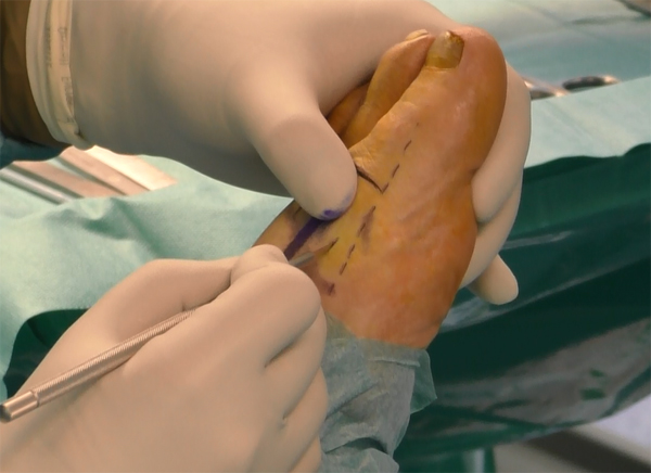 Die hier vorgestellte Einleitung beschreibt die Abtragung der Osteophyten in minimalinvasiver, arthroskopisch gestützter Technik. Diese erlaubt eine effiziente Resektion der Osteophyten, Synovektomie und Release der Sesambeine über zwei kleine Zugänge.