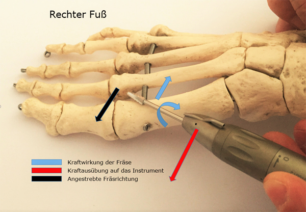 Auf die besondere Gefahr der Verletzung der Extensorensehnen wurde bereits im Abschnitt „Operationstechnik“ hingewiesen. Es muss jedoch nochmals betont werden, dass bei laufender Fräse kein digitaler Druck von dorsal auf das Gelenk ausgeübt werden darf. Die beschriebene manuelle Sehnen-/Kapselretention mittels eines Fadens wird aus Sicherheitsgründen ausdrücklich empfohlen. Die Resektion der distalen Exostosenanteile sollte insbesondere bei noch geringer Erfahrung mit minimalinvasiven Verfahren mehrmals unterbrochen werden, um mit der Fräsenspitze die Grundgliedbasis zu tasten und deren Verletzung zu verhindern. Des Weiteren sollte die Neigung der Fräse zur Achse des Os metatarsale kontinuierlich kontrolliert werden, um eine zu ausgedehnte Resektion des Köpfchens und die damit verbundene Subluxationsgefahr des Gelenkes zu vermeiden.