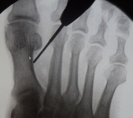 Die minimalinvasive Basisosteotomie des 1. Strahles stellt – entsprechend offenen Verfahren - die Operationstechnik mit dem größten Korrekturpotential dar. Sie kann entweder mit einer medialen Exostosenabtragung des Metatarsale-I-Köpfchens oder aber mit einer zusätzlichen minimalinvasiven subcapitalen medialen Closing wedge Osteotomie (Isham) kombiniert werden 2. Diese Doppelosteotomie stellt ein hochpotentes Werkzeug zur Korrektur von schweren Hallux Valgus Fehlstellung dar. Im Unterschied zu offenen Verfahren an der Basis des Os metatarsale I sind minimal invasiv immer nur in Closing Wedge Technik möglich, womit eine leichte Verkürzung des 1. Strahls verbunden ist. Die Indikation entspricht dem offenen Techniken.