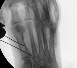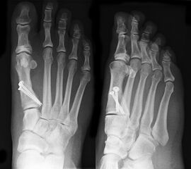 - Röntgenkontrollen (Vorfuß d.p. und seitlich) postoperativ ohne Belastung. Weitere Kontrollen erfolgen 6 Wochen, sowie 3, 6 und 12 Monate jeweils unter Belastung.