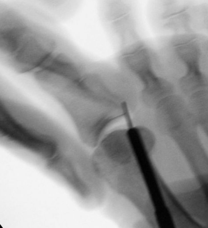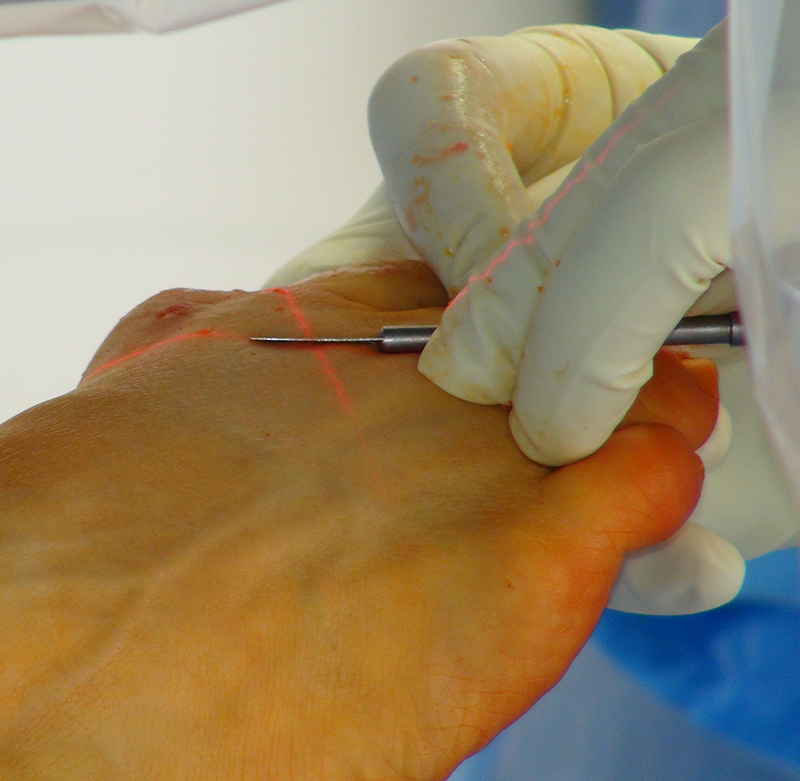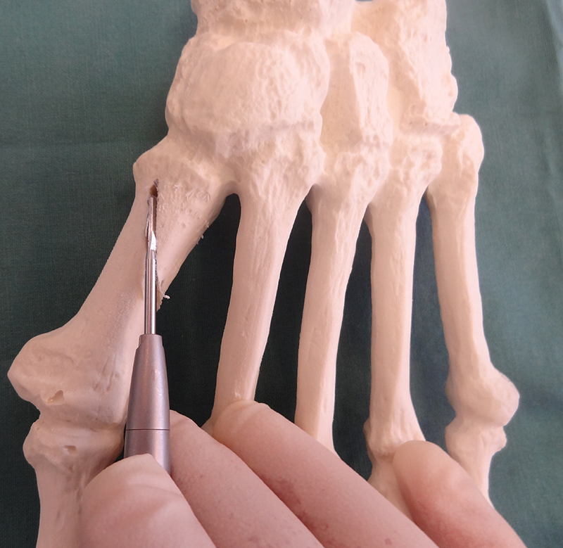 Die hier beschriebene Technik umfasst die Prinzipien der Basisosteotomie, analog dem offenen Vorgehen unter Beibehaltung der bekannten und etablierten Konzepte der Vorfußkorrektur 10.
