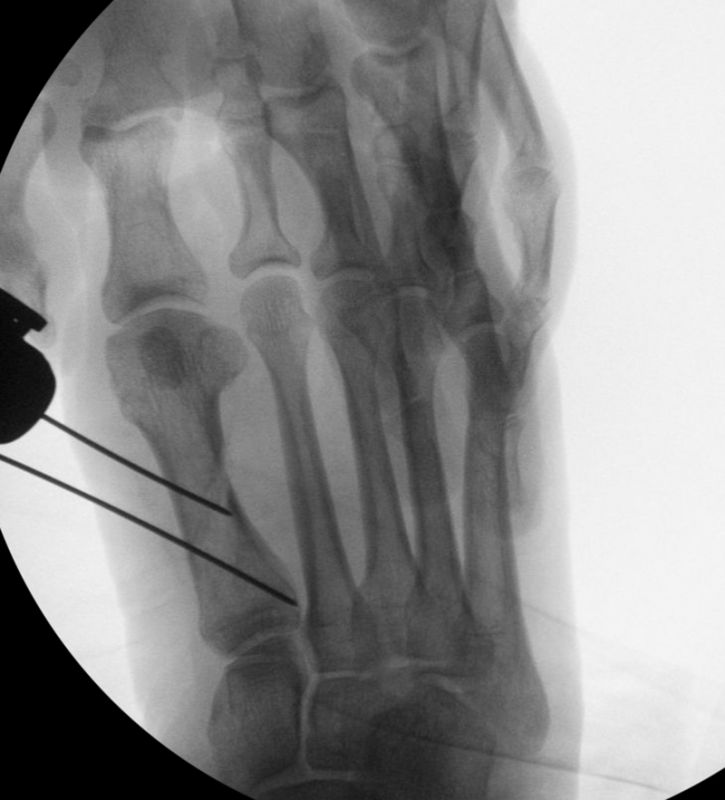 - Gefahr des sekundären Bruches der medialen Kortikalis mit sekundärer Dislokation und Verkürzung des Metatarsale I.